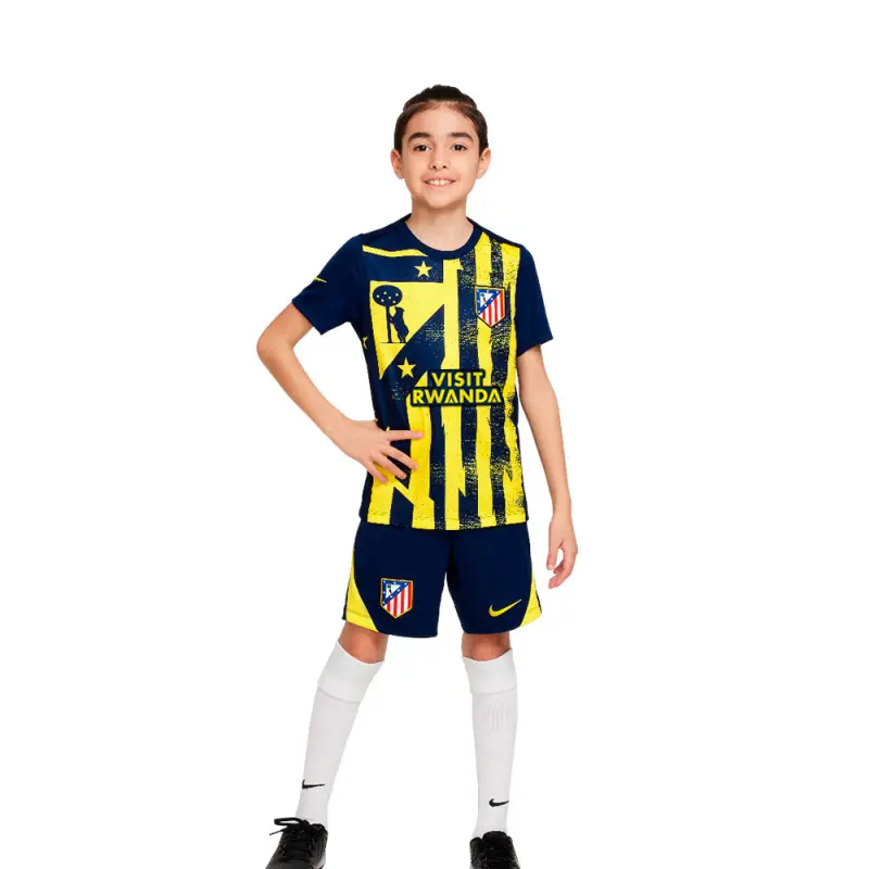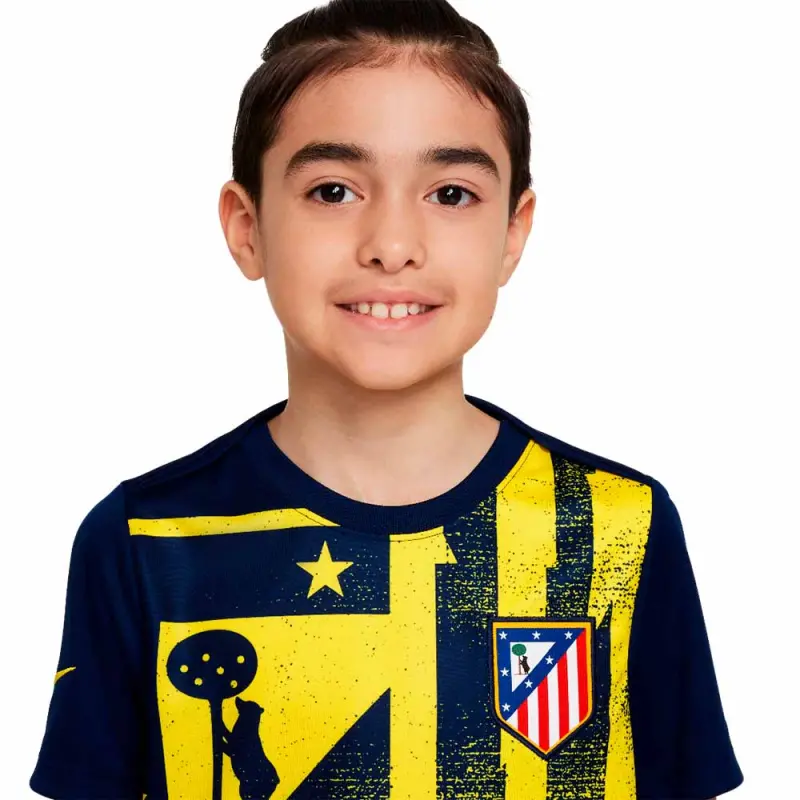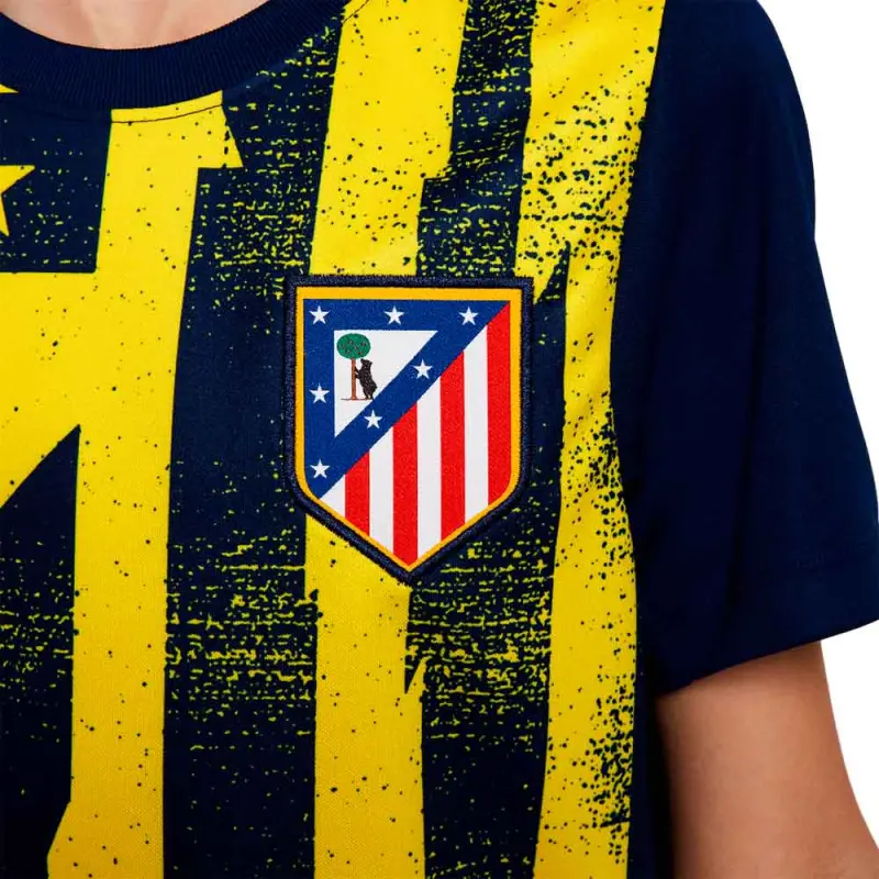 Auf marineblauer Basis sticht das große Vereinswappen in leuchtendem Gelb auf der Vorderseite hervor und vermittelt die ganze Stärke und Energie von Atlético.