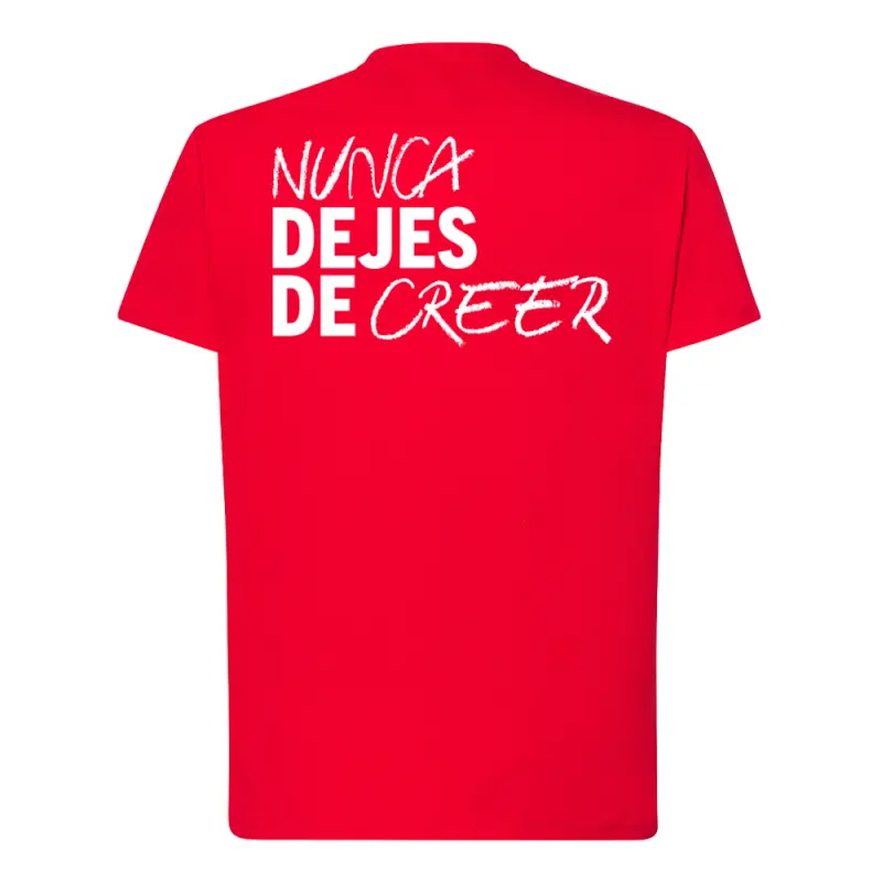 Wir präsentieren das „Never Stop Believing“-T-Shirt in leuchtendem Rot, speziell entworfen für junge Atlético de Madrid-Fans.